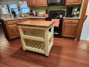 After looking at various plans and user ideas on the Internet, I decided that a mobile island with a middle shelf would fit in well. The frame was constructed using 2×4 and 1×4 lumber, glue, and fasteners.