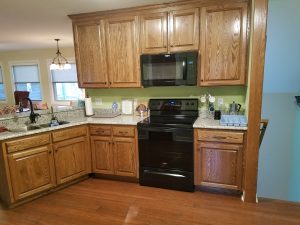The work area was stained with two coats of Early American stain, followed by three applications of furniture wax. After buffing out the countertop, we moved the island to the apartment kitchen. Besides providing us with a flexible work and storage piece of furniture, it blends well in the kitchen.